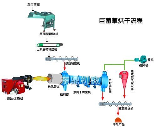 巨菌草烘干機(jī),主要由巨菌草破碎設(shè)備,巨菌草粉碎機(jī),上料皮帶運(yùn)輸機(jī),螺旋輸送機(jī),柴油燃料機(jī),熱風(fēng)管道,給料器,滾筒主干燥機(jī),密封拌料機(jī),螺旋輸送機(jī),旋風(fēng)除塵器,引風(fēng)機(jī)等組成,根據(jù)物料狀態(tài)及用途用戶可以適當(dāng)選配擠壓脫水設(shè)備和環(huán)保除塵設(shè)備。在機(jī)器工作時(shí),濕物料先經(jīng)過(guò)巨菌草粉碎機(jī),在此過(guò)程中完整的巨菌草植株被迅速破碎,成為大小均勻的草料,然后隨著上料設(shè)備和螺旋輸送設(shè)備進(jìn)入滾筒內(nèi)部,至此,巨菌草烘干的前期準(zhǔn)備工作正式完成。在滾筒內(nèi)壁設(shè)置有鏟板,在滾筒內(nèi)部的巨菌草碎料被抄板不斷抄起,這是為了讓巨菌草可以充分和滾筒內(nèi)部的熱風(fēng)接觸,提升設(shè)備的烘干效果,達(dá)到事半功倍的作用。由于滾筒設(shè)置有傾角,因此物料會(huì)隨著滾筒轉(zhuǎn)動(dòng)由一端滑向另一端,直到出料口完成物料的烘干階段,烘干好的物料會(huì)隨著出料口的螺旋輸送機(jī)被運(yùn)至包裝打包的階段,滾筒中的廢氣會(huì)進(jìn)入除塵設(shè)備,保證氣體不會(huì)污染大氣,經(jīng)過(guò)除塵脫硫之后,最終排入空氣中。